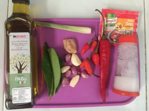 Sangrai lengkuas, sereh, daun salam, cabe merah, cabe kecil, bawang merah dan putih senggunakan minyak zaitun. Smpek berbau sedap
