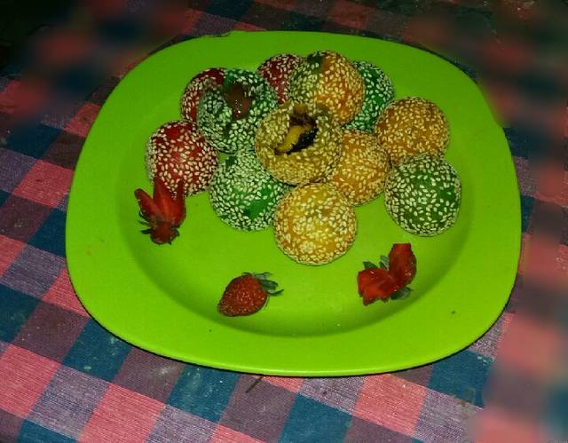 Setelah 15 menit adonan siap untuk di bentuk bulatkan dan timbang antara 21-23 gram setelah di bulatkan pipihkan dan isi dengan coklat tadi bulatkan lagi dan celupkan di air sedikit saja terus baluri dengan wijen serta di remas2 supaya wijen bisa melekat setelah itu bulatkan lagi sampai adonan habis