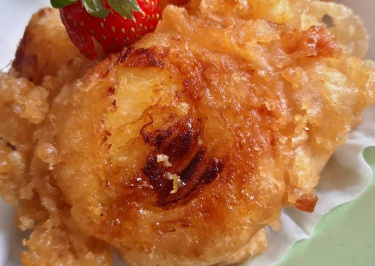 Lumuri tape yang sudah diisi dengan gula merah dengan adonan tepung.