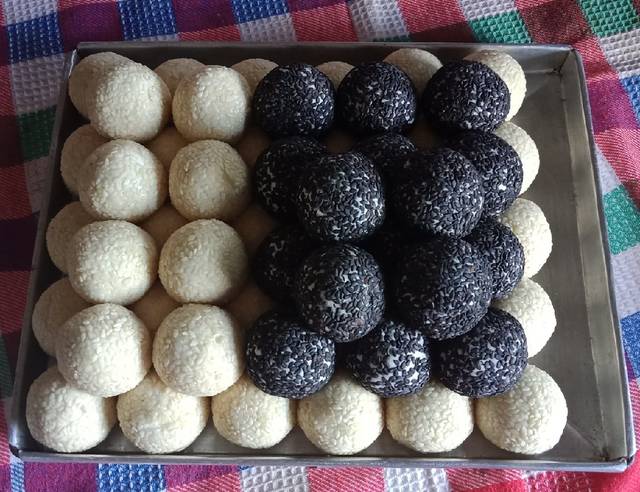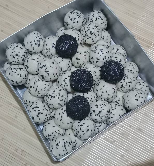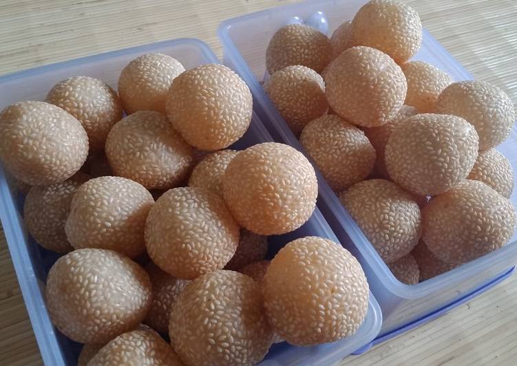 Penyelesaian : Ambil bahan kulit (saya +-20gr) isi dengan bahan isi lalu bulatkan. Kemudian celupkan ke air sebentar lalu gulingkan ke wijen dan padatkan. Lakukan sampai habis... Goreng dengan api kecil, dengan minyak yg hangat jangan panas. Aduk perlahan (takut wijen rontok). Goreng hingga mengembang dan kulit kecoklatan. Angkat,tiriskan dan sajikan... 😋😋😋