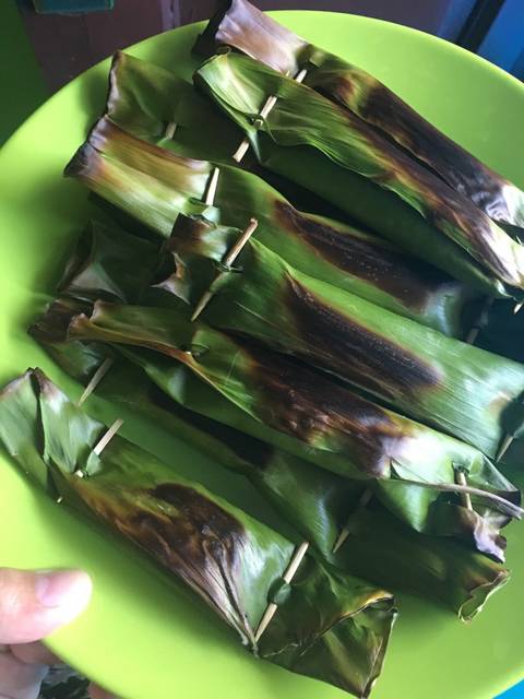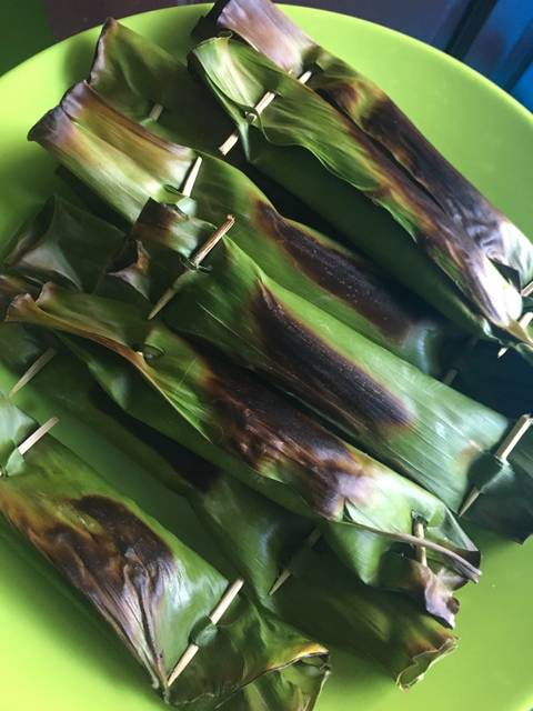 4. Setelah semua adonan dibungkus, maka siap dipanggang di atas teflon (bisa di bakar di bara api juga). Setelah daun pisang sedikit gosong dan mengering, segera diangkat.
