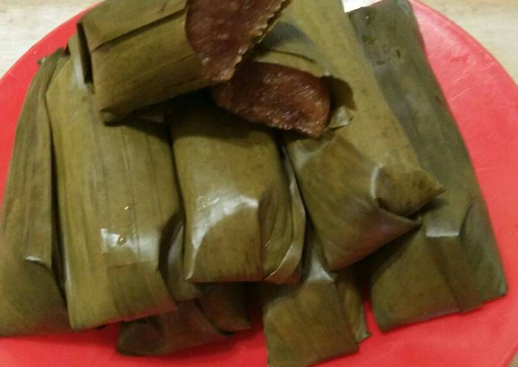 Layukan daun pisang dg cara d layukan d atas kompor atau bs jg dkukus daun ny. Potong² sesuai ukuran yg d inginkan.