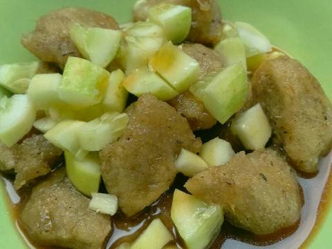 Terakhir, Goreng adonan pempek yang sudah direbus tadi. Dan siram dengan cuko..serta tambahkan mentimun. Bisa juga pake mie yang sudah direbus.