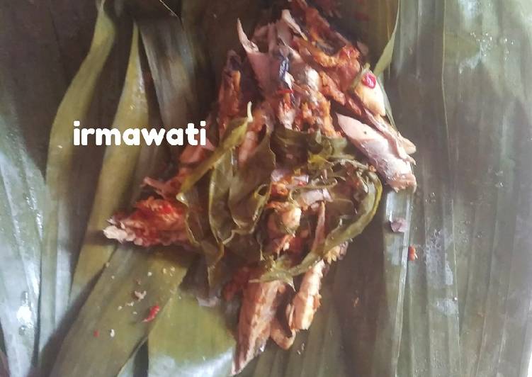 Siapkan daun pisang secukupnya. Beri ikan pindang lalu beri bumbu secukupnya tambahkan daun singkong beri bumbu secukupnya. Tambahkan ikan pindang dan beri bumbu secukupny. Lakukan berulang-ulang hingga habis.