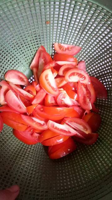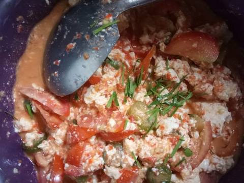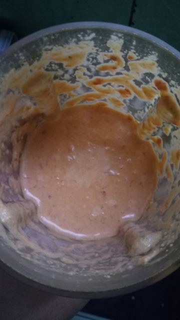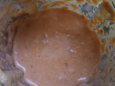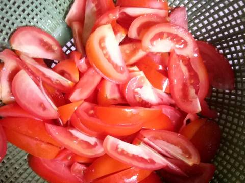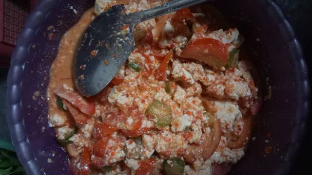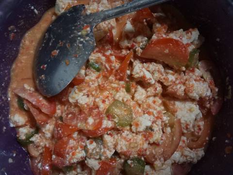 Siapkan wadah besar, tuangkan bumbu halus. masukkan tomat, tahu yg sudah diperas dan belimbing.
