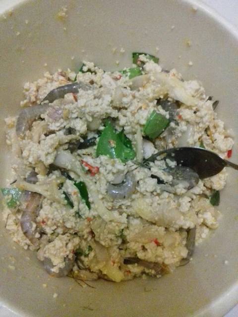 Bersihkan udang, lumatkan tahu menggunakan sendok sampe lembut, cuci bersih jamur dan potong2 memanjang. Sisihkan.
