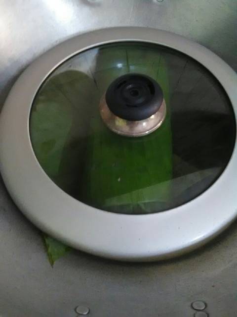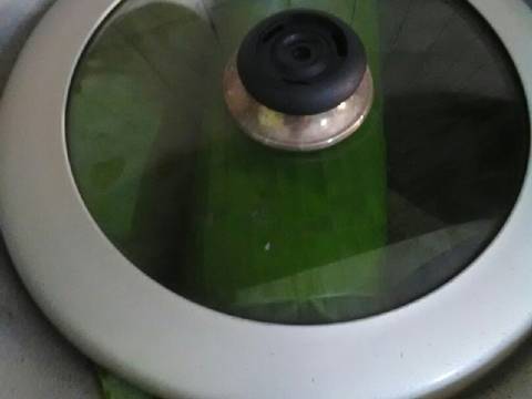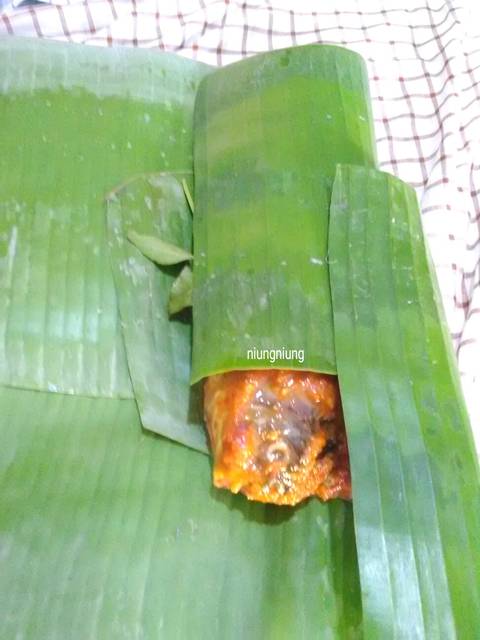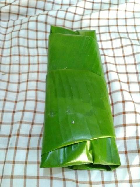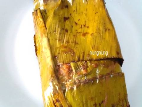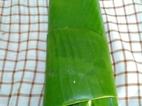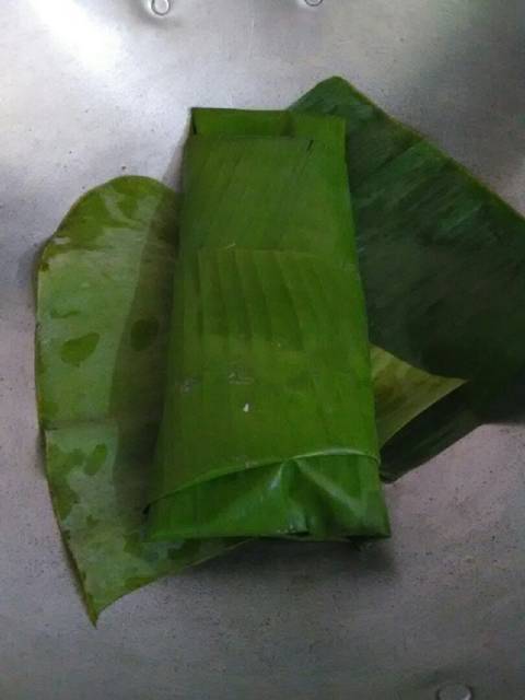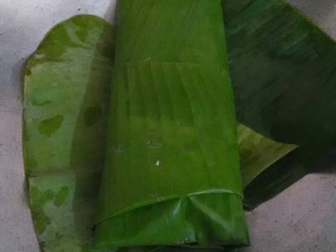 Panggang diatas kuali -/+ 30 menit dengan api kecil ya bunda, kalau dikukus cukup 15 menit.kalau saya dipanggang seperti itu supaya lebih wangi daun pisangnya