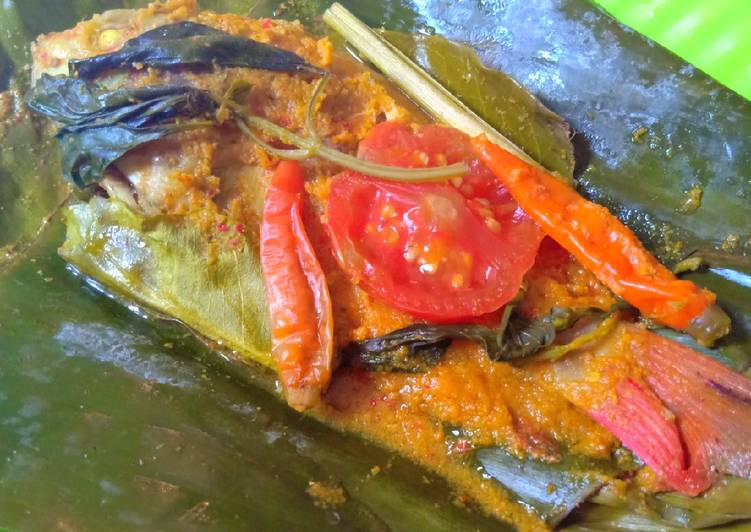 Siapkan daun pisang yg sdh dibersihkan 2 lapis supaya saat dikukus tidak mudah robek. Balurkan bumbu yg sdh diblender secara merata ke ikan nila, tambahkan bumbu pelengkap spt daun salam, daun jeruk, kemangi, tomat, sereh cabe rawit. Bungkus dengan daun pisang, lalu sematkan lidi agar tidak berantakan. Diamkan kurang lebih 15 menit supaya bumbu meresap.