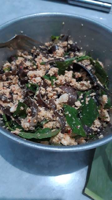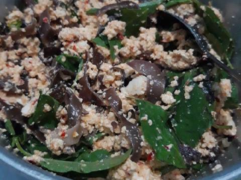 Rebus jamur kuping. Sambil menungggu lalu blender bumbu bawang merah bawang putih kemiri dan cabai. Sisihkan. Hancurkan tahu sampai lembut.