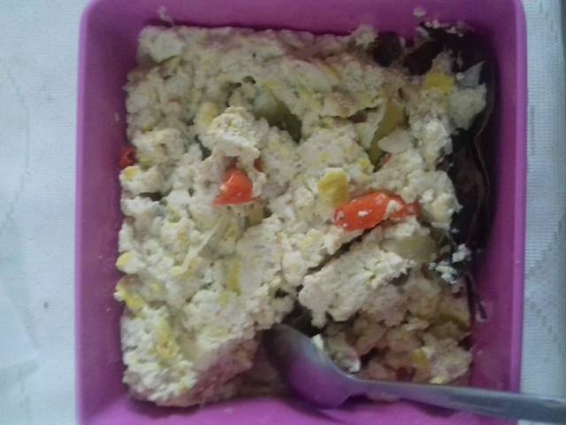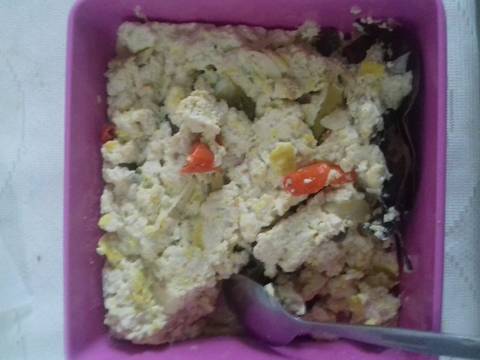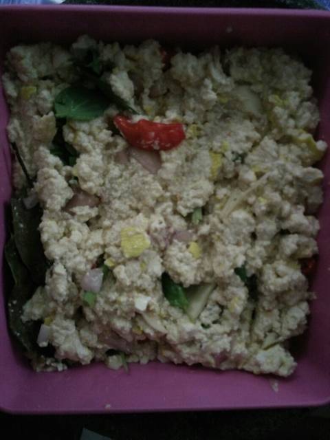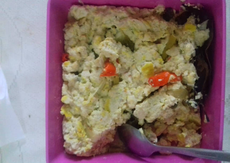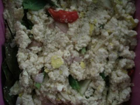 Campurkan semua bahan dengan tahu, telur, dan garam merica penyedap. Aduk rata dan cek rasa.