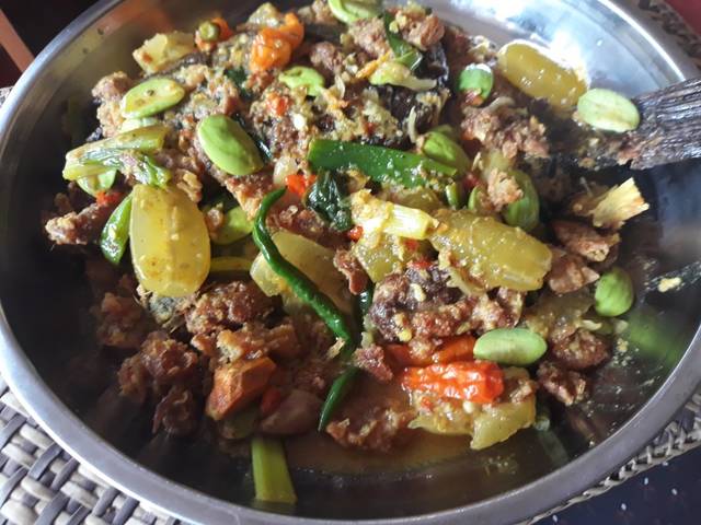 Tambahkan air. masak sampai mendidih. kemudian masukkan ikan dan masak sampai air menyusut. masukkah pete. masak kira-kira 3 menit. koreksi rasa. siap disantap