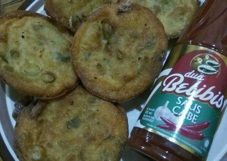Campur terigu,irisan daun bawang seledri, bumbu halus, telur dan air, sehinggawnjadi adonan yg pas (seperti adonan mendoan), koreksi rasanya