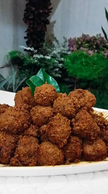 Tumbuk daging (saya pakai chopper). Ambil 1/4 bagian bumbu halus, 1/2 bagian kelapa sangrai dan garam secukupnya. Aduk rata lalu bentuk bulat2 sesuai selera.