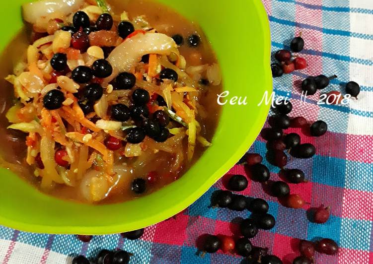 Tumbuk semua bumbu kecuali cuka masak(boleh di ulek),tumbuk kasar ya mom.. lalu tambahkan air.. tuang ke dalam buah2an yg sudah di serut.. aduk rata.. tambahkan cuka masak.. koreksi rasa..