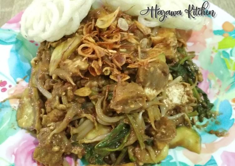 Masukkan kangkung, toge, iris timun, iris tahu dan tempe sesuai selera. Campur rata, kemudian hidangkan di piring. Taburi sedikit bawang goreng dan lengkapi dg krupuk uyel nya....ðð