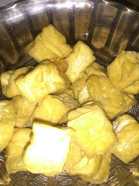 Siapkan bahan isian. Belah empat tahu kemudian goreng hingga kecoklatan. Sisihkan.