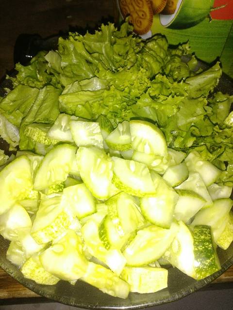 Cuci bersih selada, iris-iris seruas jari. Sisihkan. Begitu juga dengan timun, cuci bersih, belah empat kemudian iris-iris dengan ketebalan sesuai selera.