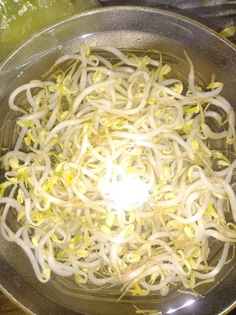 SRendam tauge dengan air panas. Diamkan hingga tauge layu, kemudian tiris. Sisihkan.