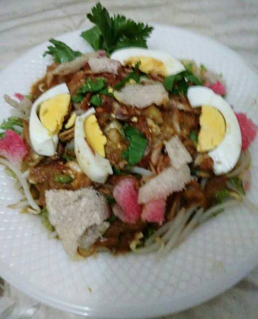 Susun isian salad di atas piring. Mulai dari selada, timun, tahu, tauge. Lalu siram dengan kuah kacang. Beri irisan daun seledri, bawang goreng dan telur rebus di atasnya. Jangan ketinggalan kerupuknya biar makin krenci. ðŸ˜Â Selamat mencoba ya Bunda..