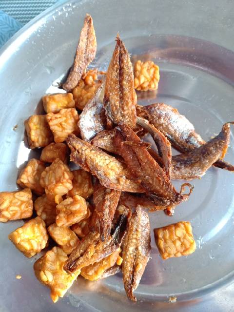 Goreng tempe (tempenya sudah direndam air garam) dan ikan asin