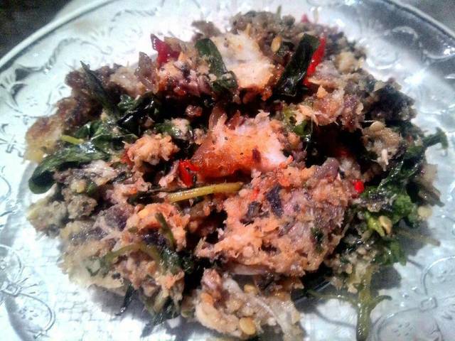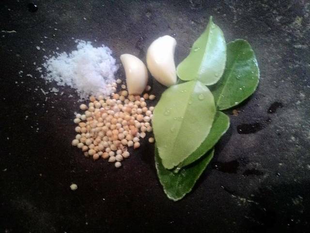1. Uleg bawang putih,ketumbar,daun jeruk dan gram hingga halus lalu tambahkan sedikit air.