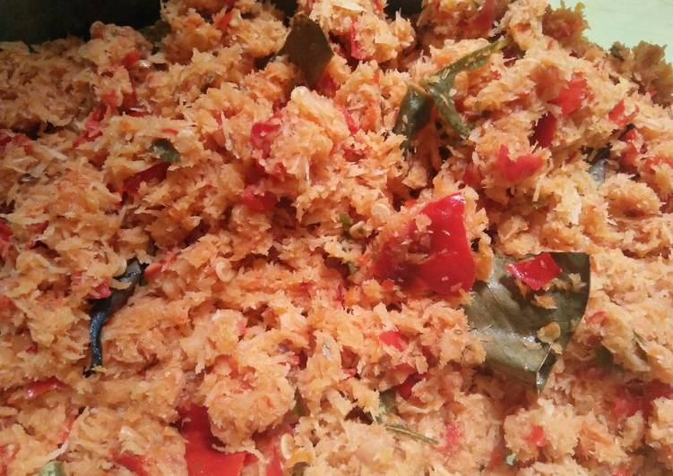 Beri gula merah dan garam lalu haluskan, masukkan kelapa, aduk hingga tercampur rata, tes rasa