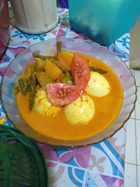 Setelah mendidih dan kentang, terongnya udah lembut baru masukkan telur yang sudah dikupas, tambahkan garam, penyedap rasa. masak lagi sekitar 15 menit, angkat dan sajikan dengan hiasan tomat jika mau.
