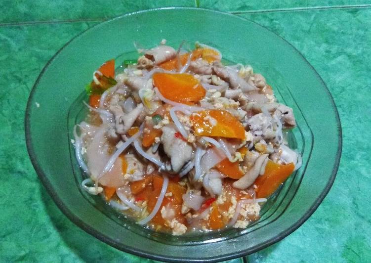 Masukkan wortel dan kerupuk udang. Masak sampai setengah matang lalu masukkan usus dan tauge.