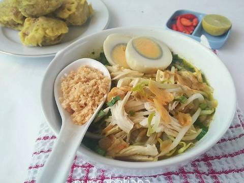 Penyajian : tata soun di dasar mangkuk, taoge, ayam, tomat, seledri dan bawang goreng. Siram dgn kuah. Sajikan dgn telur rebus, jeruk nipis, dan bubuk koya
