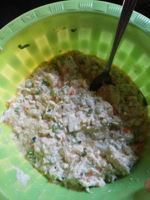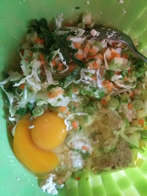 Campurkan semua bahan (tahu, potongan sayur sop, telur, bumbu halus, gula, garam, dan penyedap) kedalam satu wadah