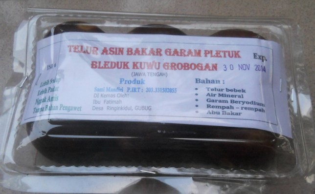 Oleh-oleh khas Grobogan telur asin bakar garam pletuk dapat dibeli di beberapa swalayan di Kabupaten Grobogan.