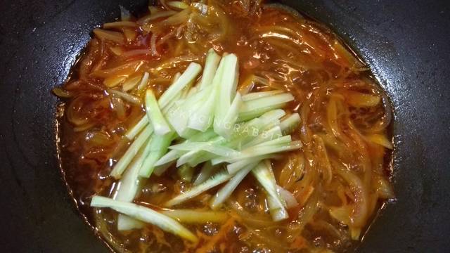 Masukkan timun, aduk rata, masak sebentar agar tekstur timun tetap crunchy