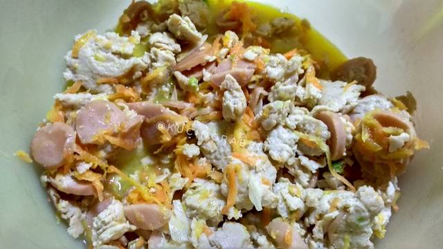 Setelah isian dingin, campurkan ke dalam kocokan telur, aduk rata