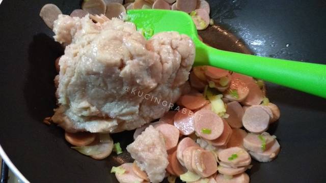 Masukkan daging ayam giling, masak hingga berubah warna dn ayam matang