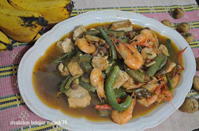 4. Masukkan terung jari. Tambahkan air hingga kira-kira "nyemek" (ada air tapi tidak banyak). Masukkan udang dan tahu goreng. Tambahkan royco dan saus tiram. Garam tidak perlu karena tauconya sudah asin. Sajikan sayur dengan nasi atau lontong.