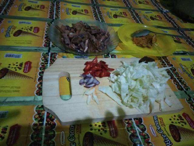 Iris-iris semua gurita yang sudah dimasak dengan air mendidih. Iris kobis, cabai merah, 1 buah bawang merah dan putih.