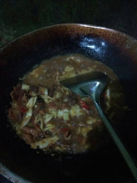 Setelah kubis layu, dan gurita di masukkan. Tongseng lagi hingga bumbu sedikit meresap. Lalu tambahkan air, gula jawa.