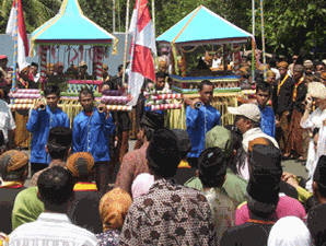 Ritual ganti Jaro Rajab ini kemudian diakhiri dengan prosesi arak arakan 5 gulungan yang berisi nasi tumpeng ini kemudian diperebutkan warga karena dipercaya bisa memberikan berkah.