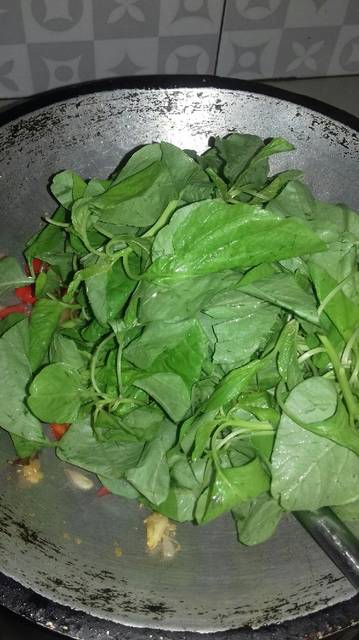 Masukan bayam, aduk-aduk hingga tercampur rata, jangan terlalu lama, angkat bayam selagi masih segar.