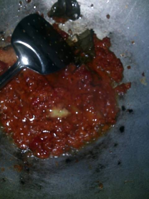 Cuci cabe merah buang bijinya, potong-potong lalu ulek