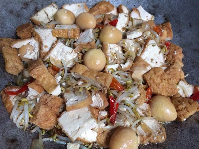 Siapkan minyak untuk menumis, setelah panas masukan bawang, oseng-oseng sampai beraroma masukan cabe, gula merah, garam. oseng, lalu masukan telur puyuh. Oseng sebentar lalu masukan tauge oseng-oseng nunggu tauge agak layu, masukan sedikit air. tes rasa. lalu masukan tahunya. oseng sebentar, selesai