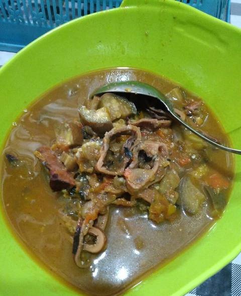 Tumis bumbu halus, hingga harum, dan masukkan terongnya sampai agak layu, tambahkan sedikit air, baru kemudian masukkan cumi kering yang telah direbus dan diiris