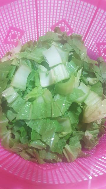 Iris sawi dan blansir dgn air panas. Tiriska