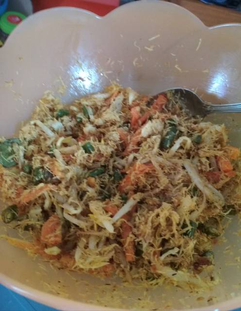 Kukus semua sayuran sampai matang kecuali tauge disiram air panas. Sisihkan