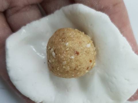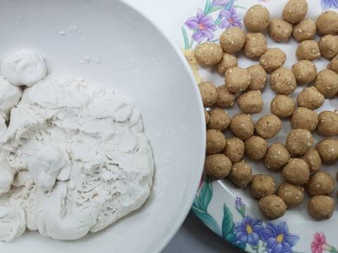 Blender semua bahan isian ronde. (Sebelum diblender, ambil 1 sdm kacang tanah sangray utuh untuk topping/ taburan). Tes rasa. Uleni, lalu dibentuk bulat2 diameter 18 mm/sesuai selera. Sisihkan.