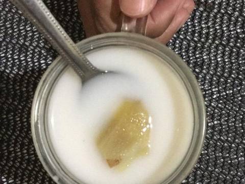 Sambil menunggu, siapkan gelas, masukkan susu kental manis dan gula