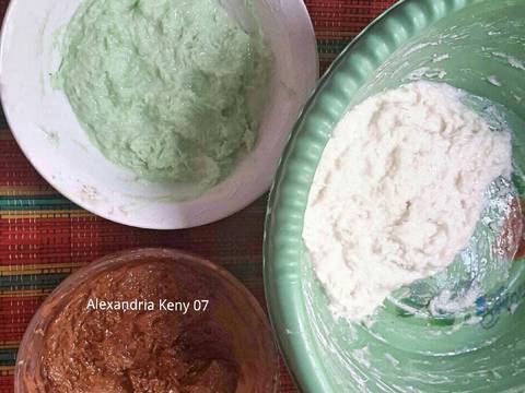 3. Bagi adonan menjadi 3 : Beri pasta pandan & coklat, satunya biarkan original kelapa