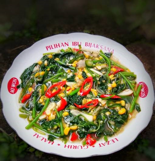 Bahan-bahan 1 ikat bayam, siangi 1 bh jagung, diiris sisir 3 bh cabe merah keriting, iris serong 3 siung bawang merah, iris tipis 2 siung bawang putih, iris tipis 1 ikat kemangi ambil daunnya secukupnya Gula, garam Langkah Tumis bawang merah dan putih, masukkan cabe merah keriting, tumis sebentar sampai wangi. Masukkan jagung, masak sampai matang kemudian masukkan bayam, gula dan garam, aduk rata, masak sampai baya...